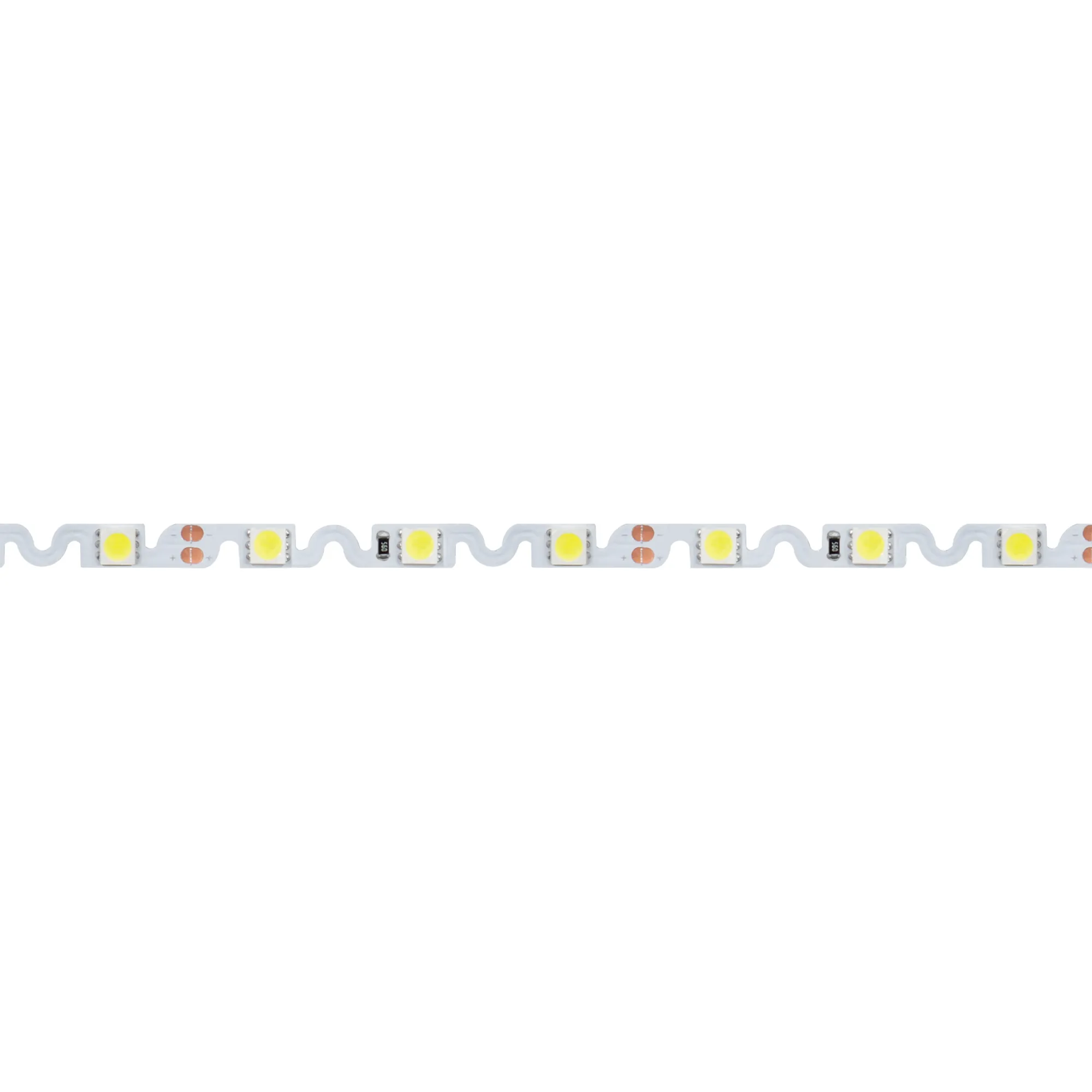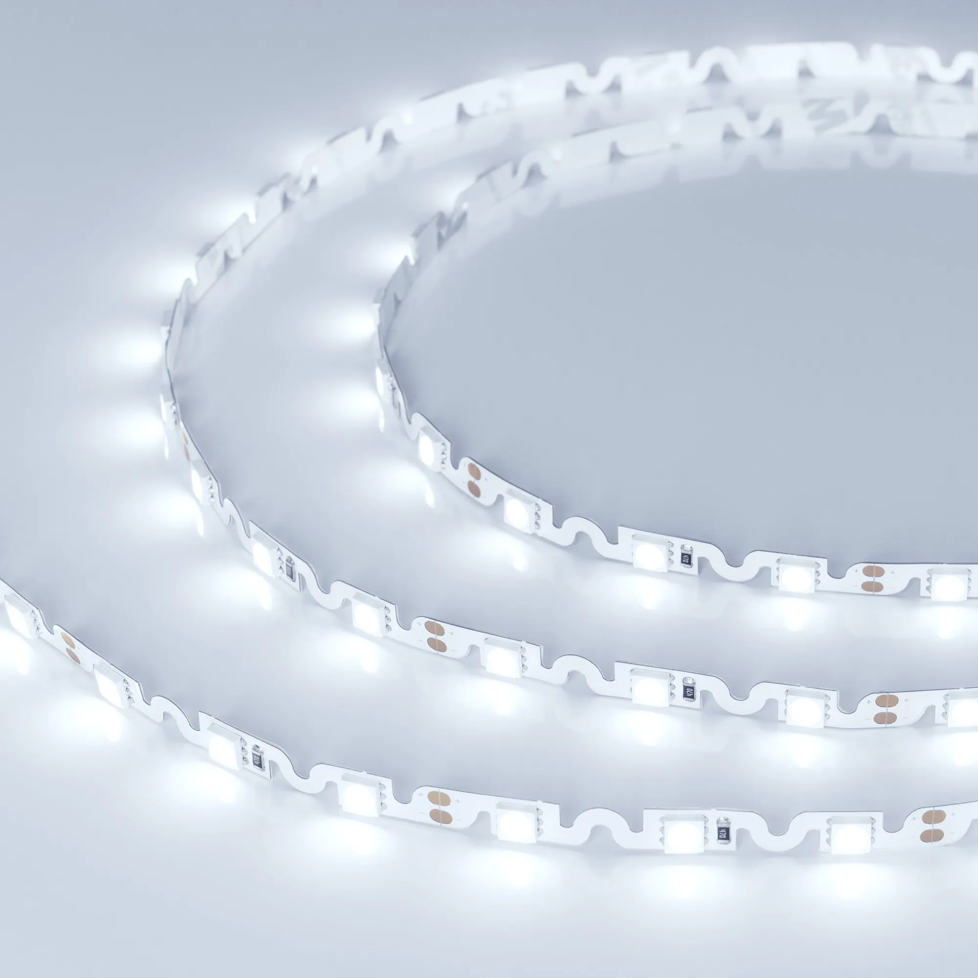 Гибкая лента с фигурной платой в форме волны, легко изгибается на плоскости. Светодиоды smd 5060, 48шт/м (240шт на 5м), белая плата 6.1мм, скотч 3М. Цвет ХОЛОДНЫЙ 7700-9600K. Питание 12V, мощность 11.5 Вт/м (57.5 Вт на 5м), угол 120°, цветопередача CRI>85. Размеры 5000х6.1х2.2мм. Мин.отрезок 62.5мм, 3 светодиода. Цена за 1м.