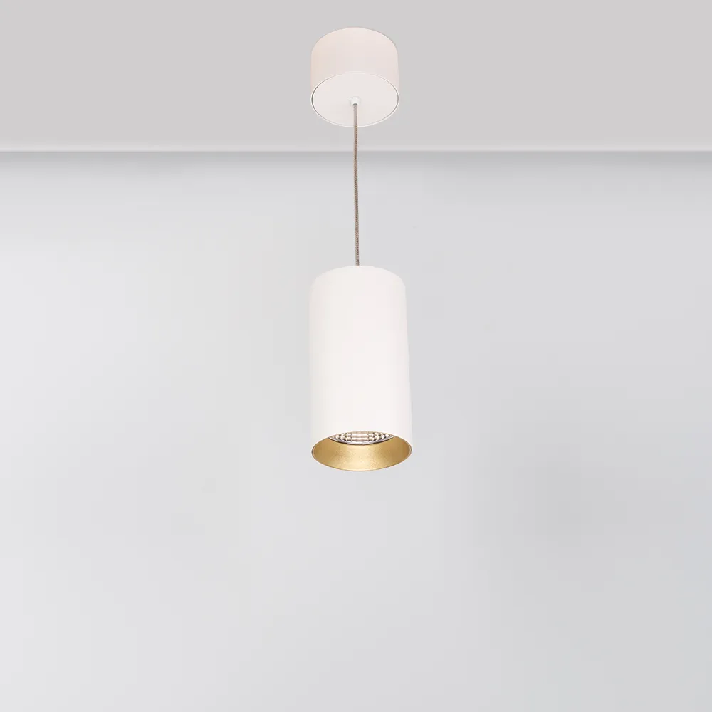 Подвесной светильник 15Вт, белый круглый корпус, золотистая вставка, металл. Цвет ДНЕВНОЙ БЕЛЫЙ 4000K, св.поток 1100лм, CRI(Ra)>80, угол 40°. Размер Ø85x155мм. Встроенный драйвер PRI:220-240VAC, SEC:DC 350mA 30-43V 15Вт.