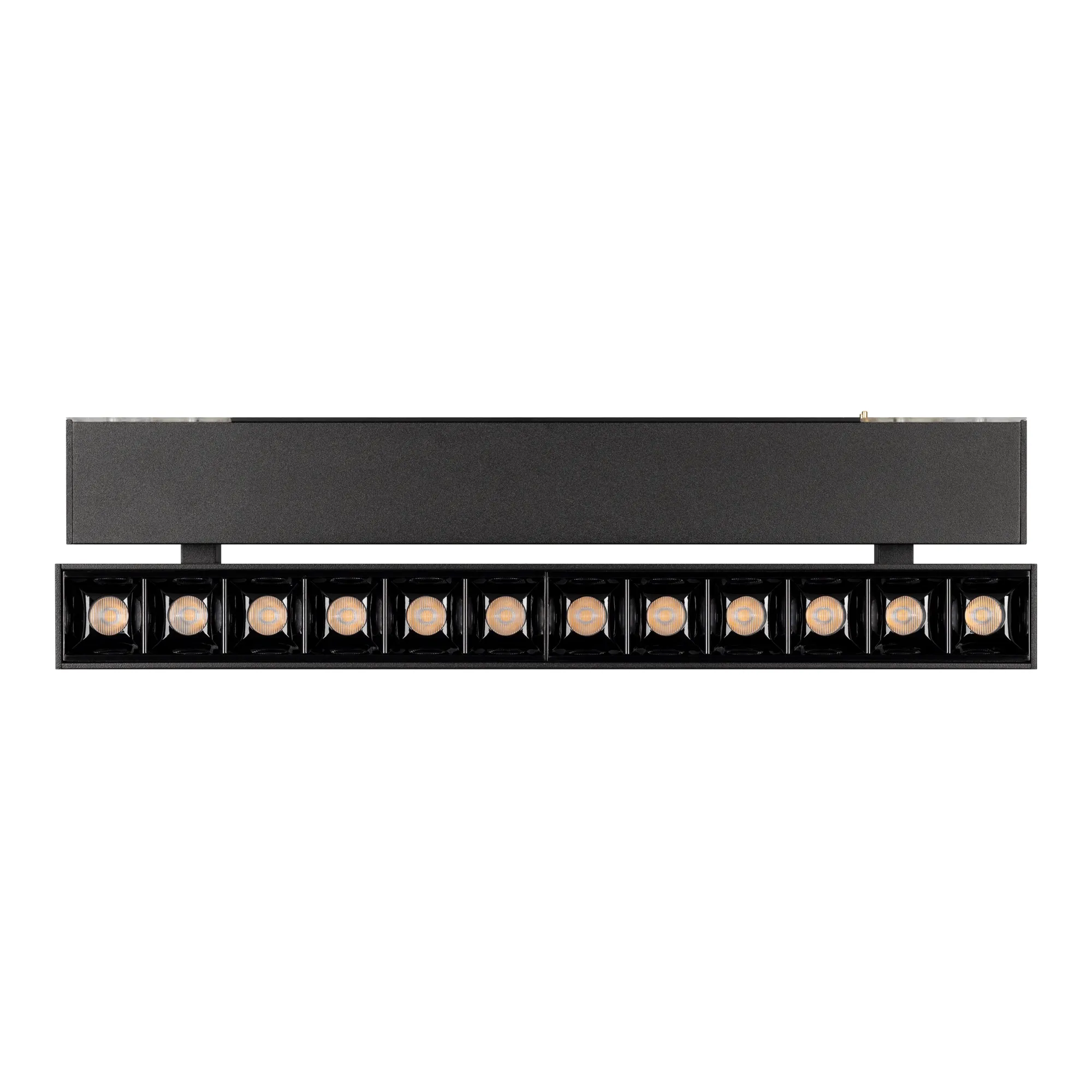Светильник поворотный для магнитных треков шириной 45мм, 12Вт. Цвет свечения ДНЕВНОЙ 4000K, световой поток 890лм, угол 15°, CRI>90. Корпус прямоугольный, металл, цвет черный, IP20. Размеры LxWxH 322x35x92.5мм. Входное напряжение DC24V, мощность 12Вт. Драйвер DС24V/AC230V поставляется отдельно. Диммируется только с 026407(1), 027633.