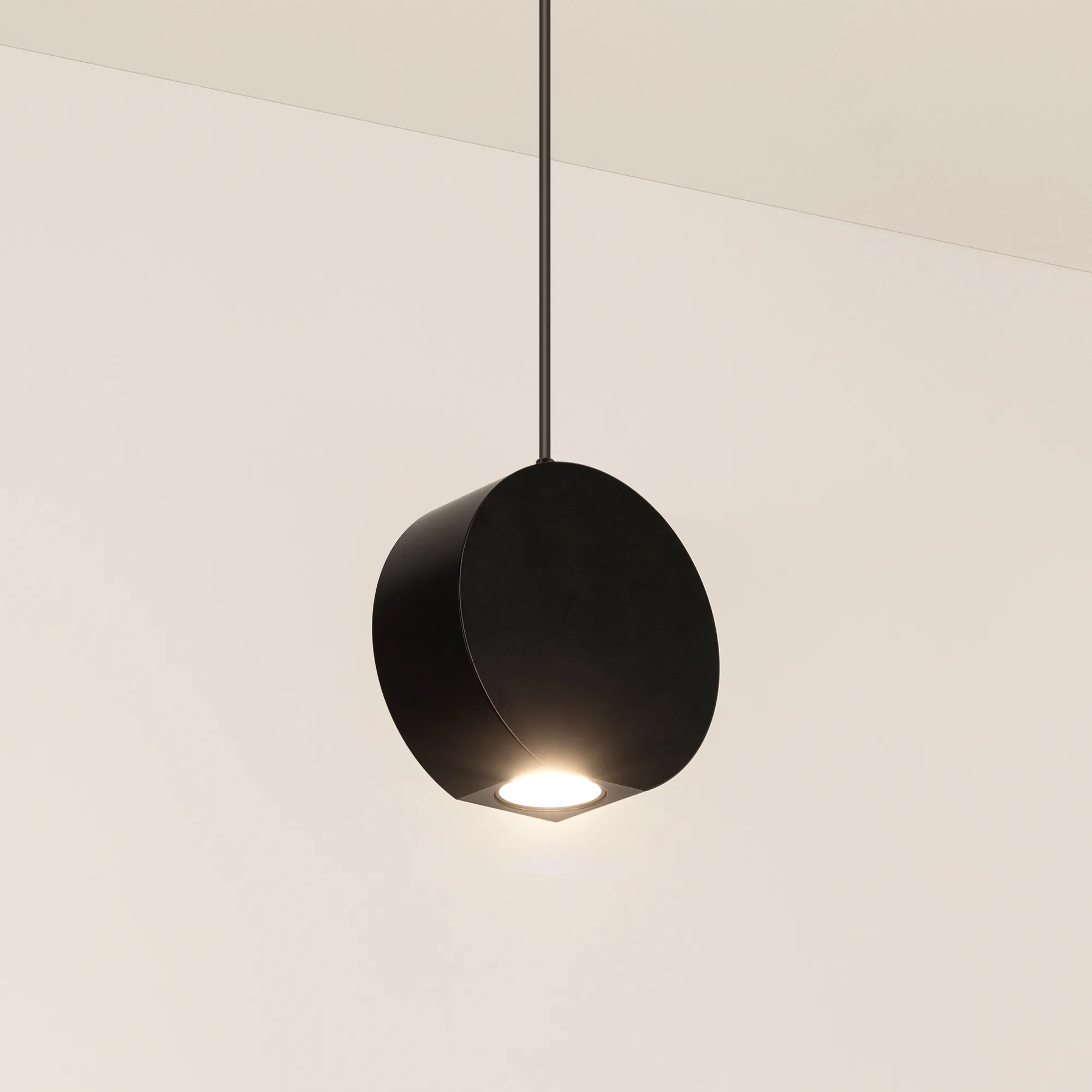 Подвесной светильник. Мощность 9 Вт, св. поток 650 лм, 73 лм/Вт, теплый 3000 K, CRI>80, угол 39°, напряжение питания 230 В. Черный круглый корпус из алюминия, экран , степень защиты IP40. Размер: диаметр 100 мм, высота 97 мм, ширина 40 мм. Монтаж подвесной, длина подвеса 1500мм, регулируемая. Габариты чаши Ø50x95 мм. Драйвер 28-42 В, 250 мА, пульсация <5%.