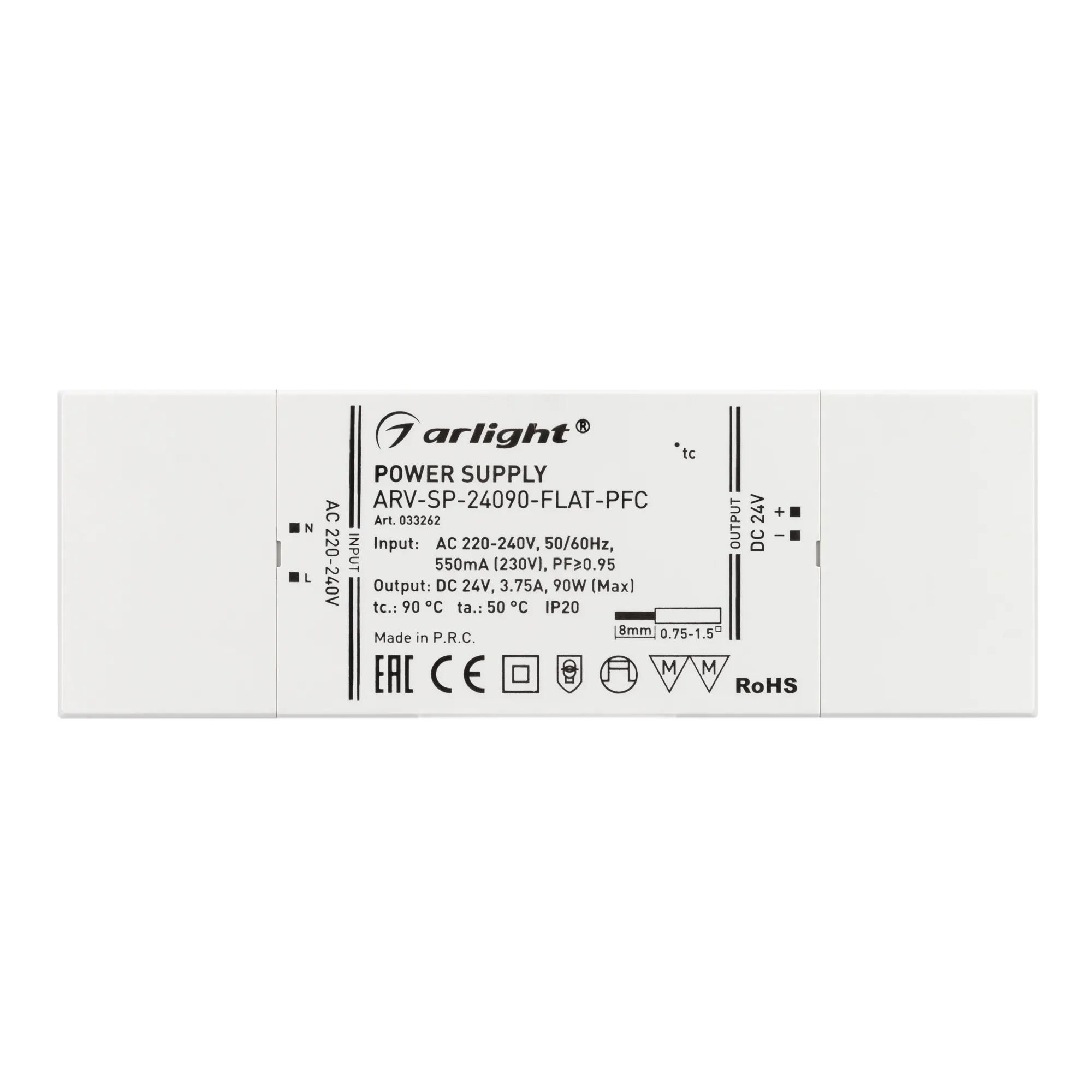 Источник напряжения с гальванической развязкой для светодиодных изделий. Входное напряжение 220-240 VAC. Выходные параметры: 24 В, 3.75 А, 90 Вт. Встроенный PFC >0.95. Сверхтонкий пластиковый корпус IP20. Габаритные размеры длина 190 мм, ширина 65 мм, высота 22 мм. Гарантийный срок 5 лет.