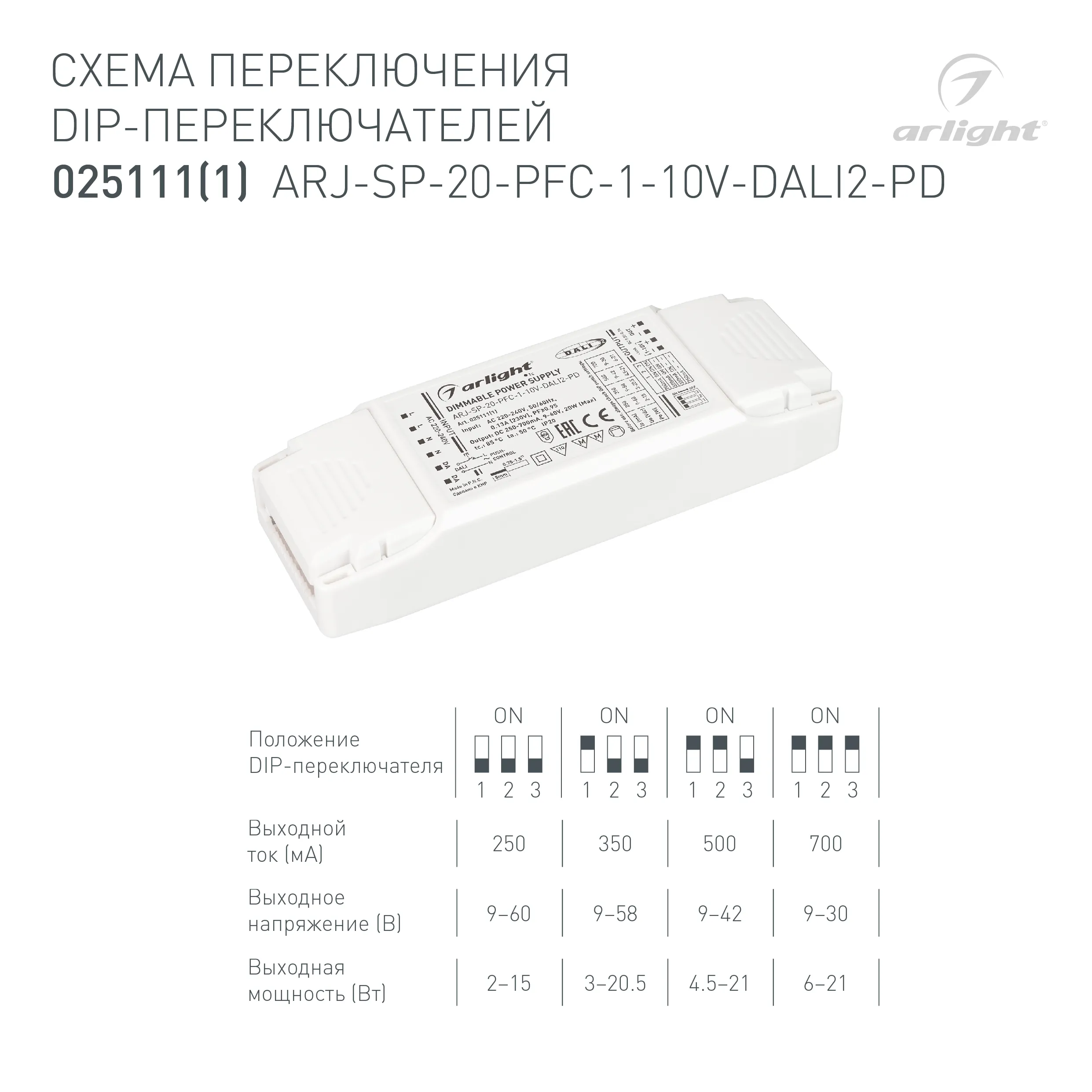 Блок питания ARJ-SP-20-PFC-1-10V-DALI2-PD (20W, 250-700mA) (Arlight, IP20 Пластик, 5 лет)