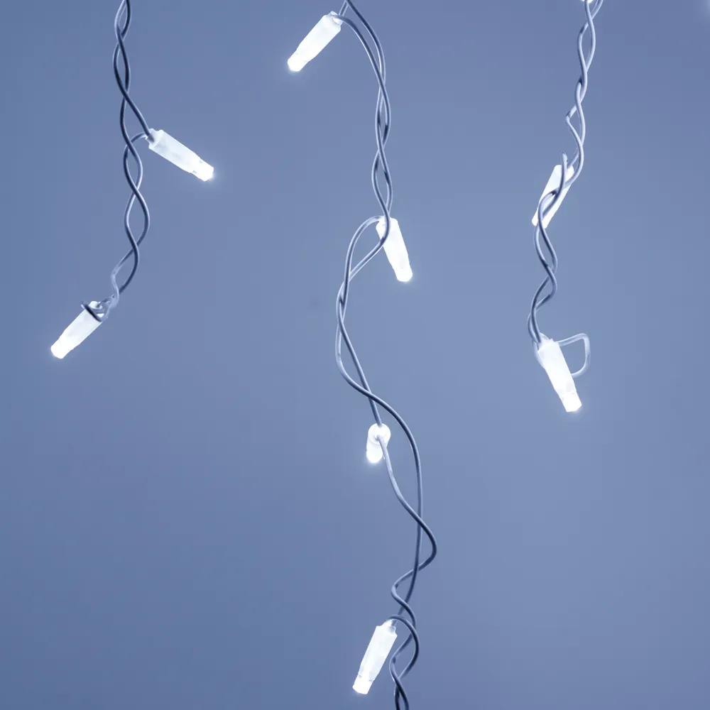 Светодиодная бахрома Pro. Размер 5600x900 мм (длина 5600 мм, по длине 48 нитей высотой 200/900 мм). Количество светодиодов 240 шт размером 7 мм. Цвет свечения БЕЛЫЙ (6000 К), эффект постоянного свечения с мягким световым рисунком (выпуклая молочно-белая линза). Провод белый, каучук. Питание 230 В, Мощность 15 Вт, защита IP65, применение на улице под навесом. Аксессуары для подключения приобретаются отдельно.