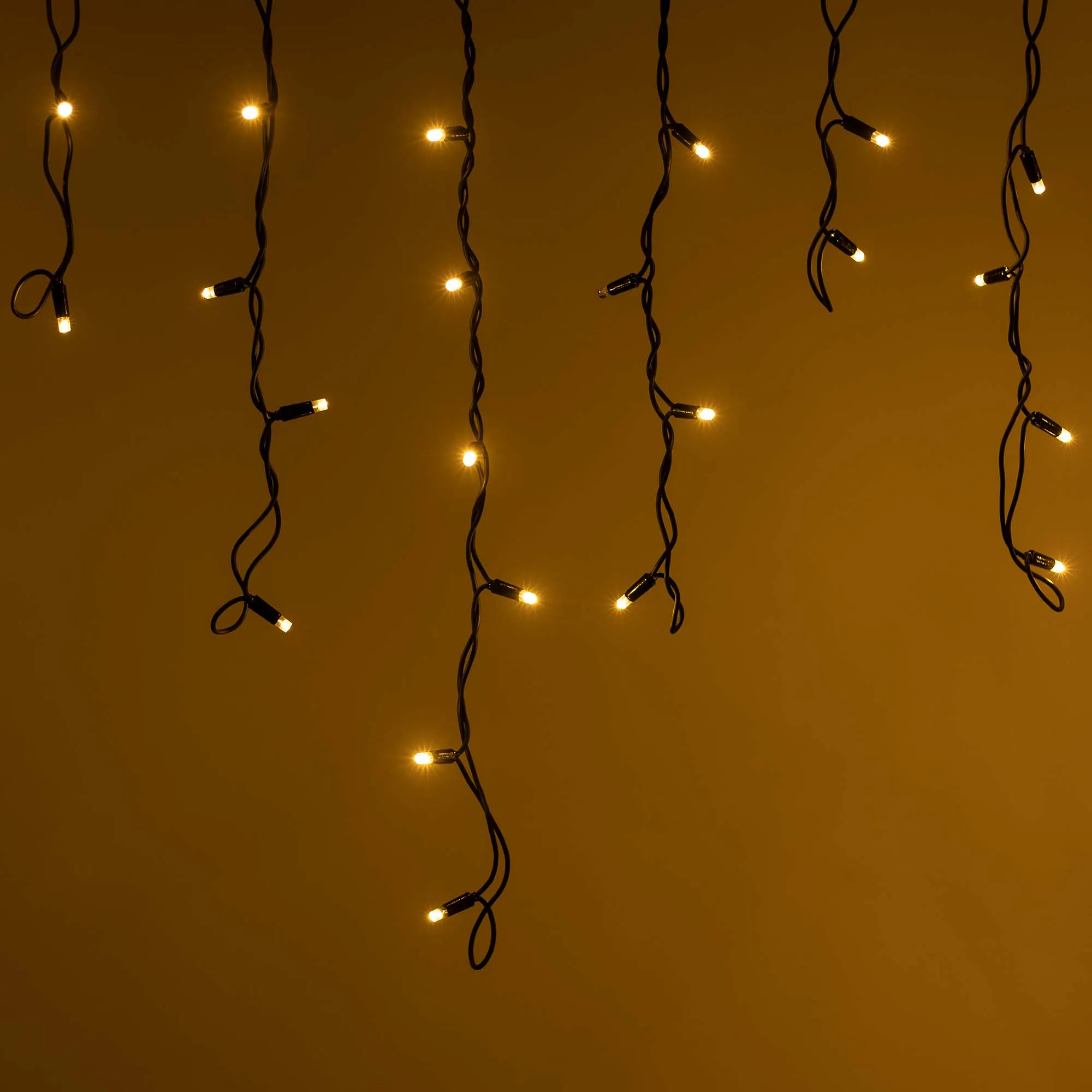 Светодиодная бахрома Pro. Размер 4000 мм (длина 4000 мм, по длине 32 нити высотой 200/600 мм). Количество светодиодов 128 шт размером 7 мм. Основной цвет свечения ТЕПЛЫЙ БЕЛЫЙ (3000 К), эффект мерцания редких точек ТЕПЛЫЙ БЕЛЫЙ (3000К) с мягким световым рисунком (выпуклая молочно-белая линза), соотношение светодиодов: 106 теплых постоянного свечения / 22 теплых с мерцанием. Эффект частого мерцания. Провод черный, каучук. Питание 230 В, Мощность 6 Вт, защита IP65, применение на улице под навесом. Аксессуары для подключения приобретаются отдельно.