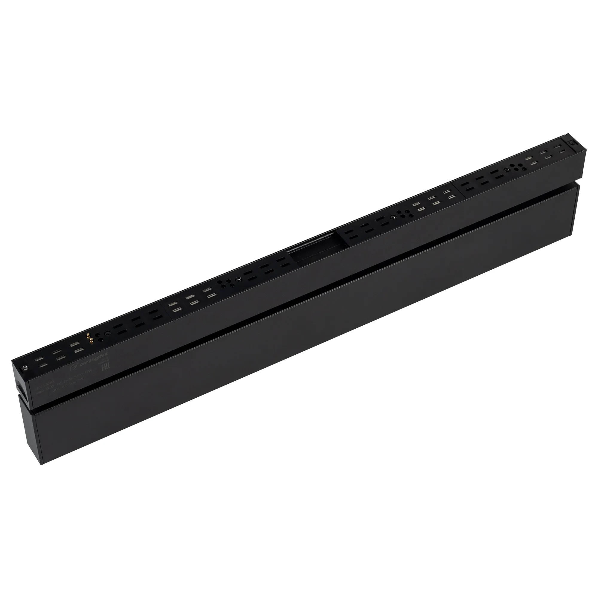 Светильник поворотный для магнитных треков шириной 25мм, 12Вт. Цвет свечения ТЕПЛЫЙ 3000K, световой поток 720лм, угол 100°, CRI>90. Корпус прямоугольный, металл, цвет черный, IP20. Размеры LxWxH 404x20x46мм. Входное напряжение DC24V, мощность 12Вт. Драйвер DС24V/AC230V поставляется отдельно. Диммируется только с 026407, 027633.