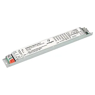 Поставка под заказ от 180 шт. Диммируемый источник тока по протоколу DALI 2.0 (диапазон 0-100%) и 1-10V (диапазон 2%-100%) с гальванической развязкой для светильников и мощных светодиодов. Входное напряжение 220-240 VAC. Выходные параметры: 9-58В (700/800/850/900/950/1000мА), 9-57В (1050мА), 9-55В (1100мА), 9-52В (1150мА), 9-50В (1200мА), 9-48В (1250мА), 9-46В (1300мА), 9-43В (1400мА), максимальная мощность 60 Вт. Встроенный PFC >0.95. Негерметичный металлический корпус IP 20. Габаритные размеры длина 284 мм, ширина 30 мм, высота 21 мм. Гарантийный срок 5 лет.