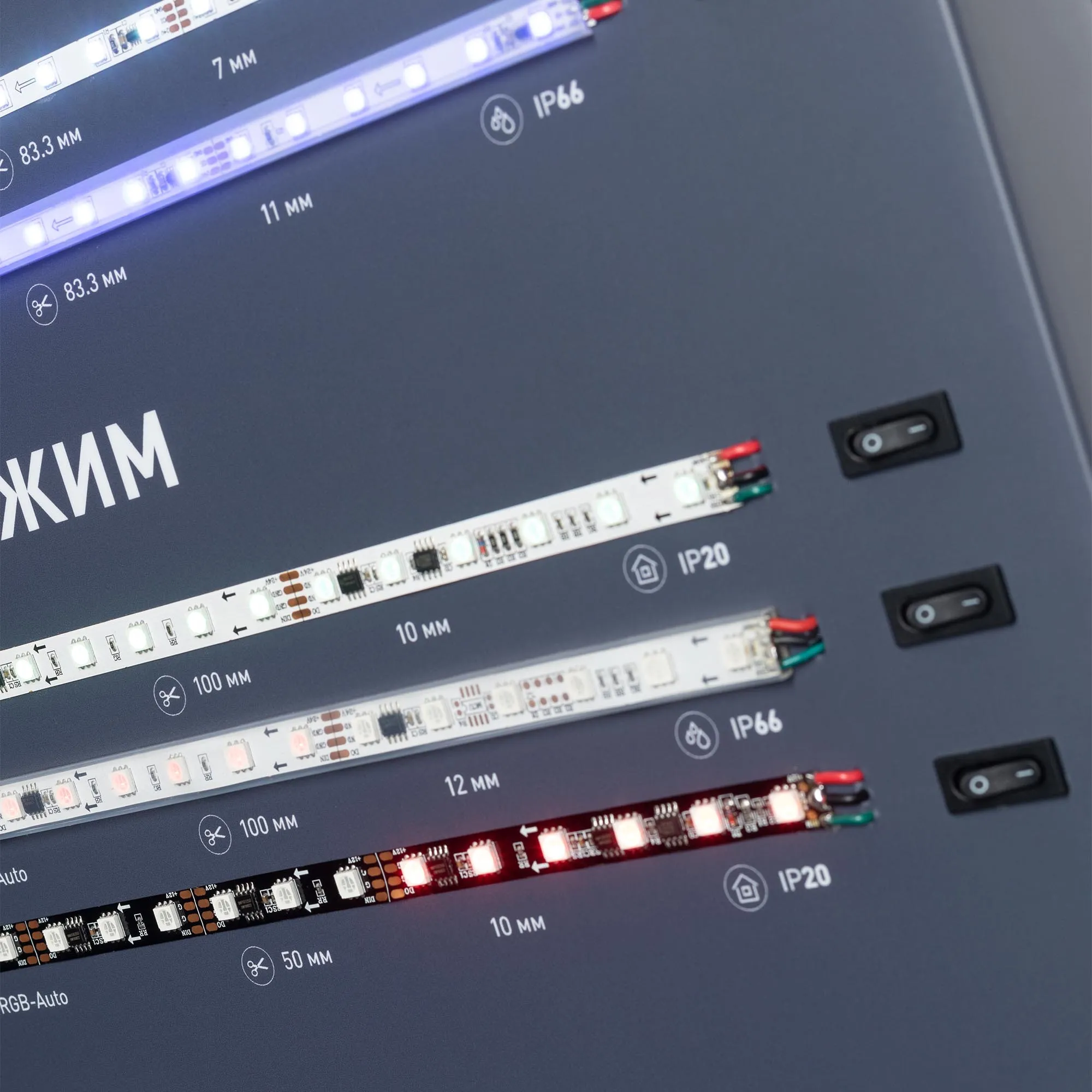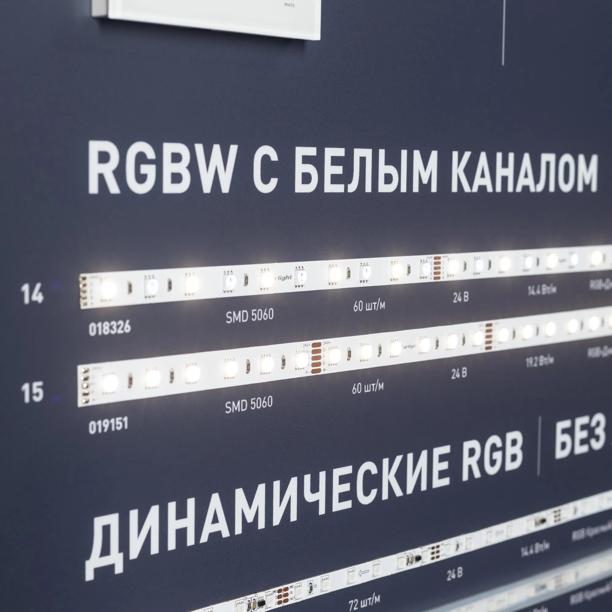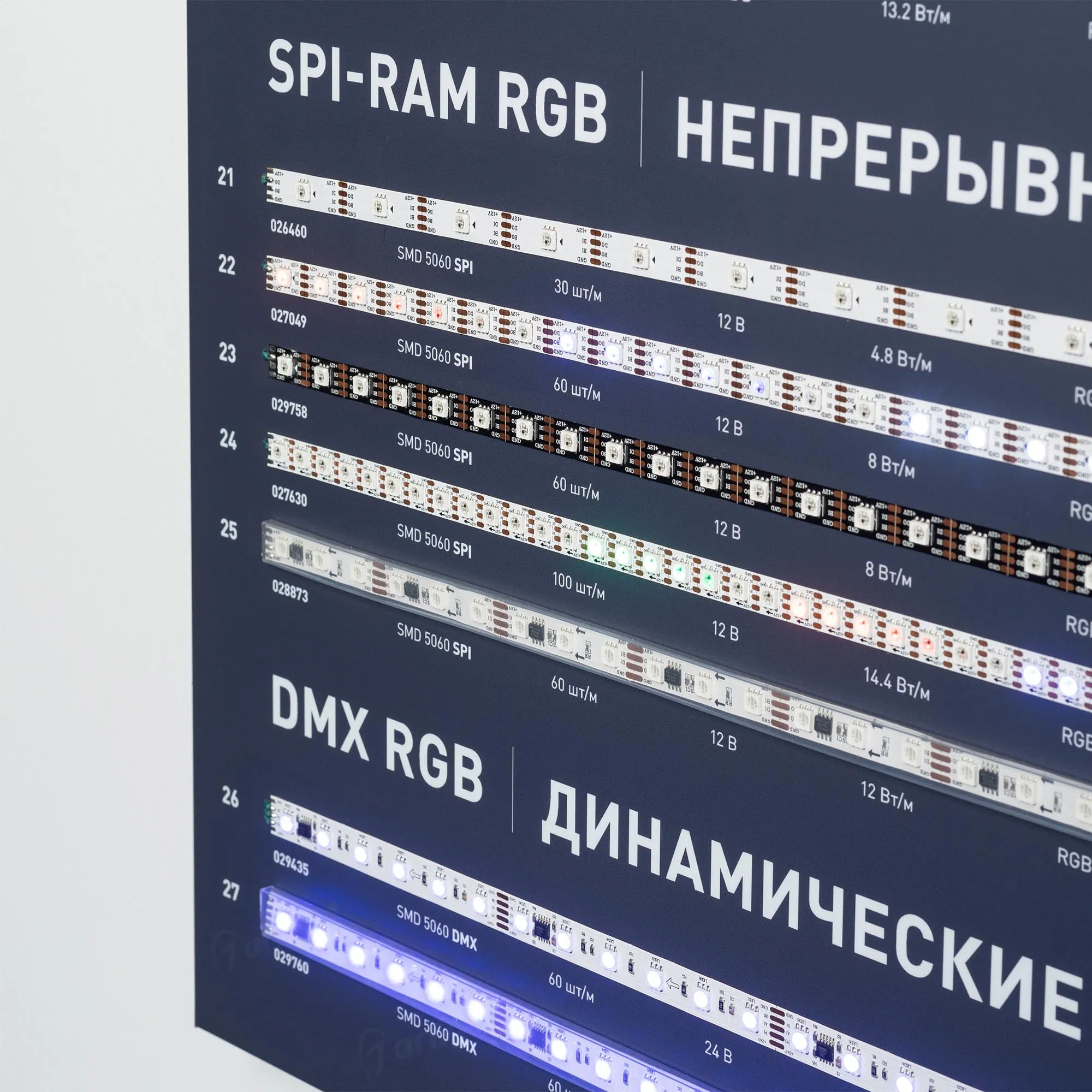 Стенд светодиодные ленты RGB и одноцветные 5/12/24В, 26 моделей (ряды #90-#115).