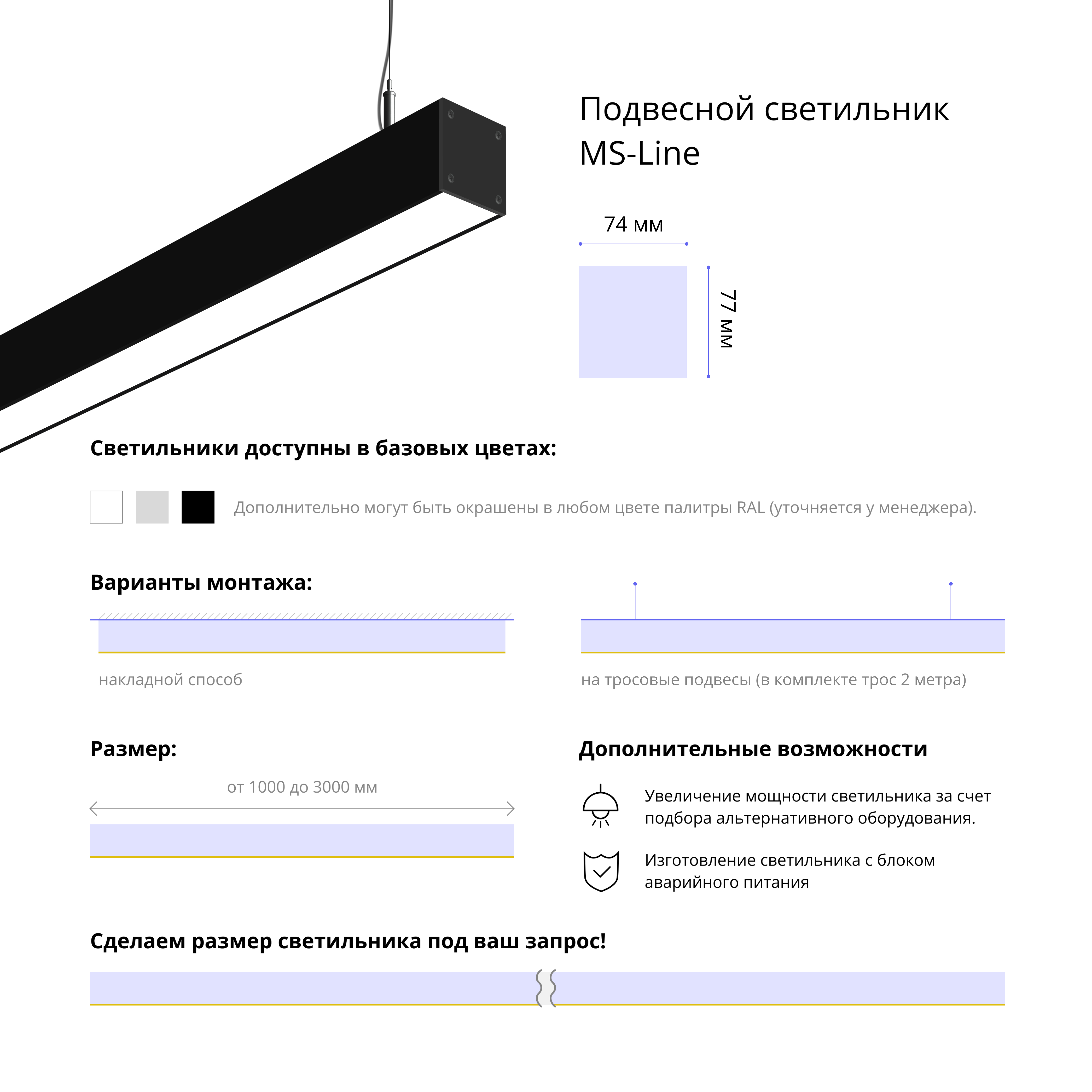 Подвесной светильник MS-LINEAR Линейный размер профиля 77х74мм длиной 2000мм мощностью 80W. Светильник собирается в алюминиевом корпусе с матовым рассеивателем, который дает равномерную засветку по всей площади.
