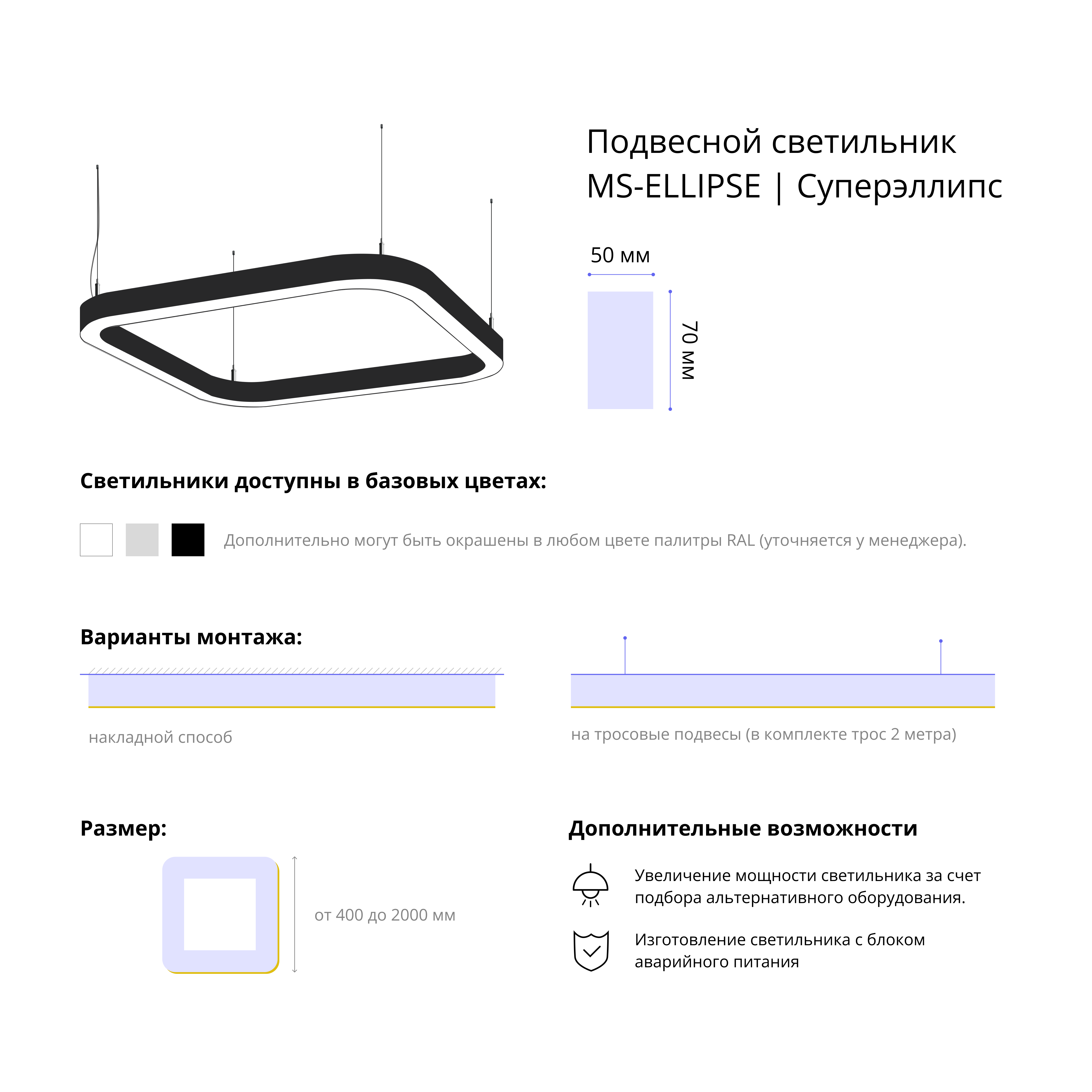Cветодиодный фигурный светильник MS-ELLIPSE Суперэллипс размер профиля 70x50мм длиной 700мм мощностью 42W. Светильник собирается из алюминиевого основния с матовым рассеивателем, который дает равномерную засветку по всей площади.