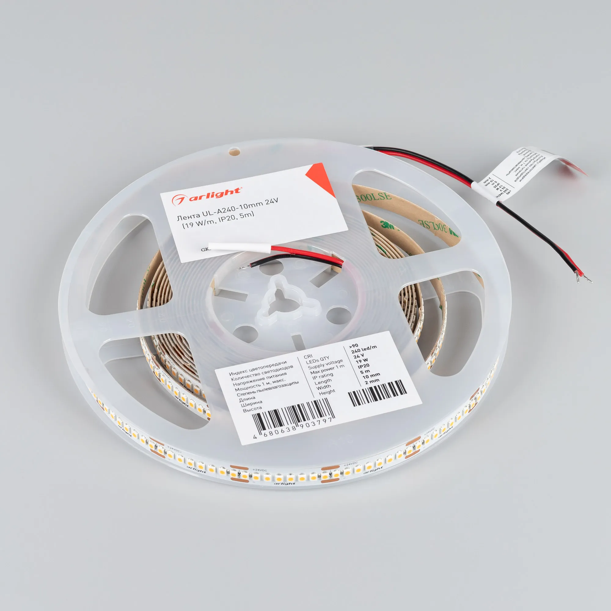 Светодиодная лента UL серии A240. Светодиоды SMD 2835, 240 шт/м, белая плата шириной 10 мм, скотч 3M. Цвет ТЕПЛЫЙ 3500K, индекс цветопередачи CRI>90, угол 120°. Питание 24 В, мощность 19 Вт/м (95 Вт на 5 м). Размеры 5000x10x2 мм. Мин.отрезок 33.33 мм, 8 светодиодов. Цена за 1 м. Обязательная установка на профиль.