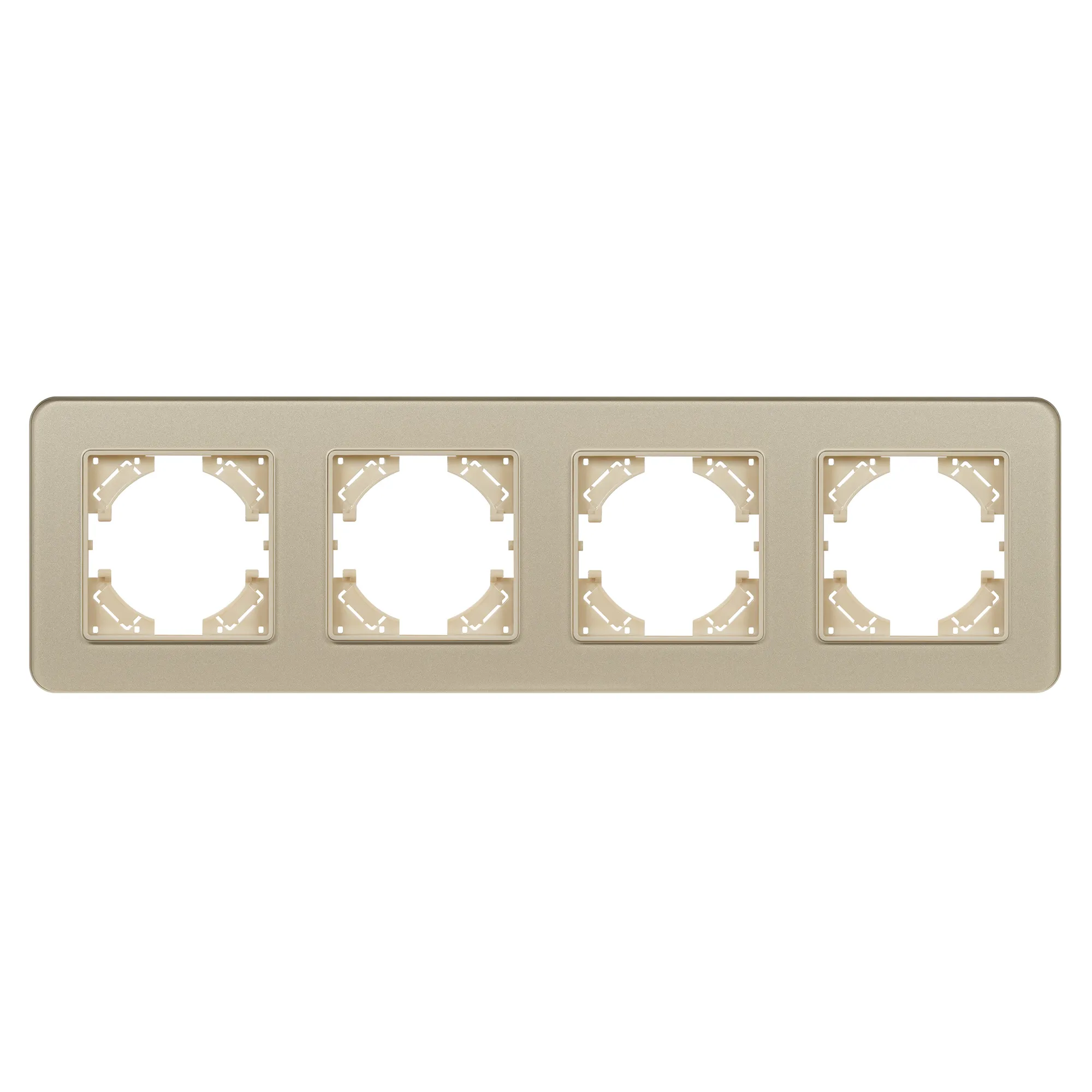 Рамка стеклянная на 4 поста, под встраиваемый механизм. Цвет - золотой. Среднего уровня герметичности IP20. Ориентация монтажа - горизонтальная (основным ориентиром служат посадочные выступы для накладки механизма).