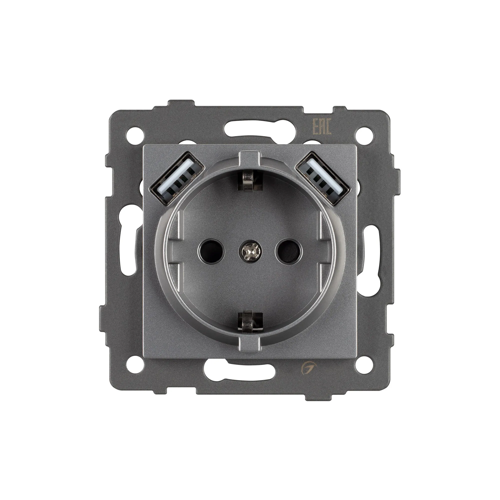 Механизм розетки с заземлением на 1 пост и 2USB Type A порта. Цвет - серый. Без фронтальной рамки. Уровень пылевлагозащиты IP20. Устанавливается в стандартный подрозетник.