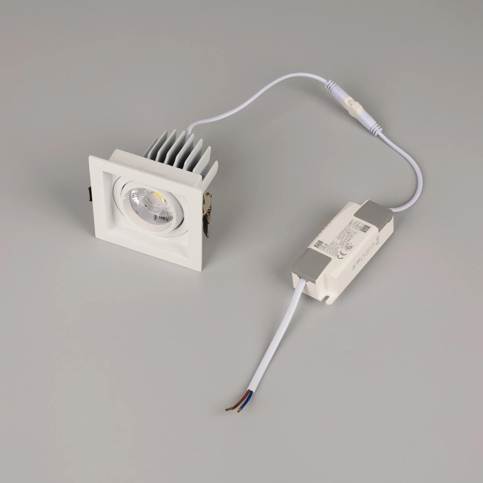 лм/Вт, тёплый 3000 K, CRI>92, угол 20°, напряжение питания 230 В. Белый корпус из алюминия, белая вставка, степень защиты IP20. Размер: длина 90 мм, ширина 90 мм, высота 80 мм. Монтаж встраиваемый, установочное отверстие: длина 75 мм, ширина 75 мм. Драйвер 27-40 В, 300 мА, пульсация <2%.