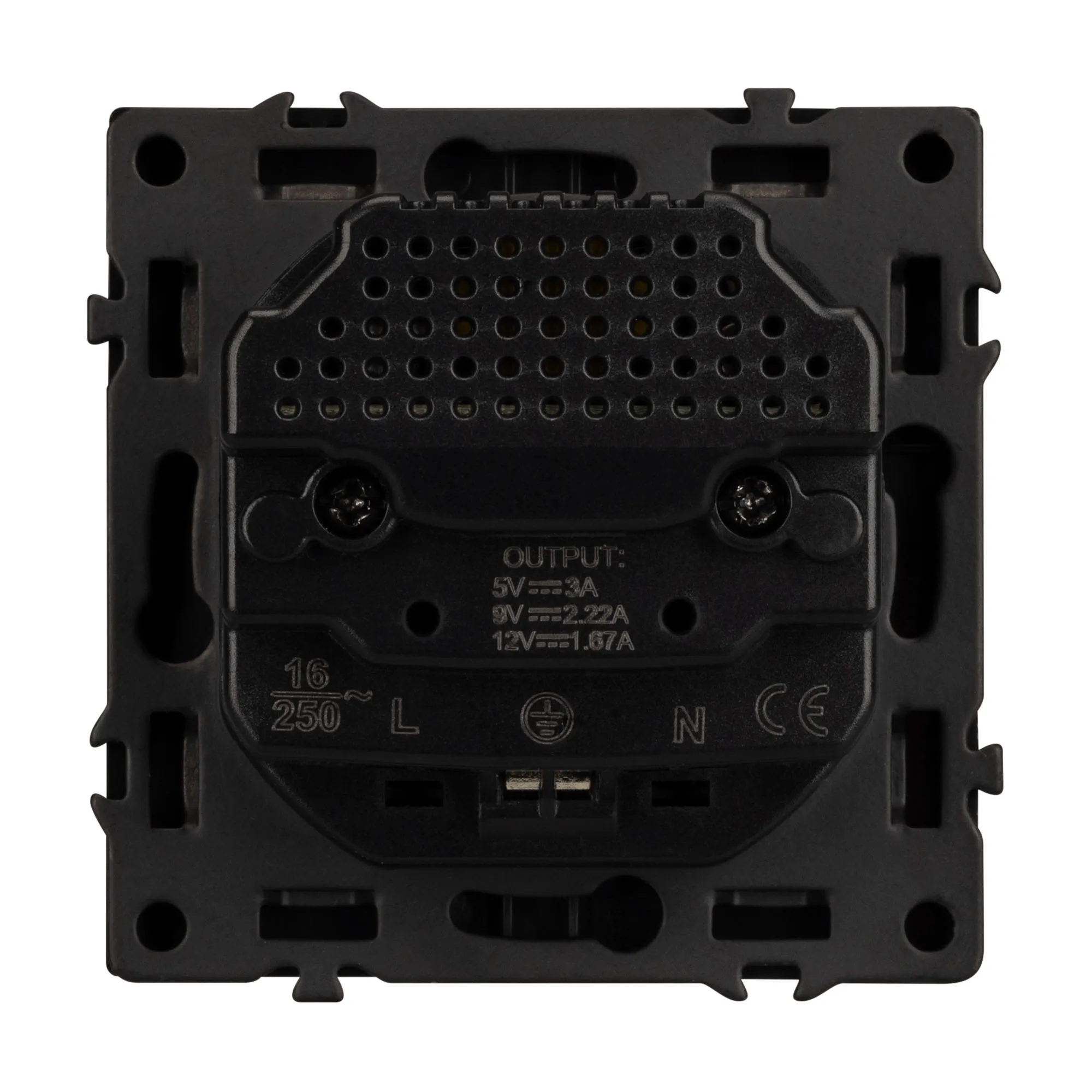 Механизм розетки с заземлением 1 пост 2 USB Type A+C порта. Цвет - серый, с Soft-Touch покрытием. Без фронтальной рамки. Уровень пылевлагозащиты IP20. Розетка устанавливается в стандартный подрозетник круглого сечения диаметром 60мм.