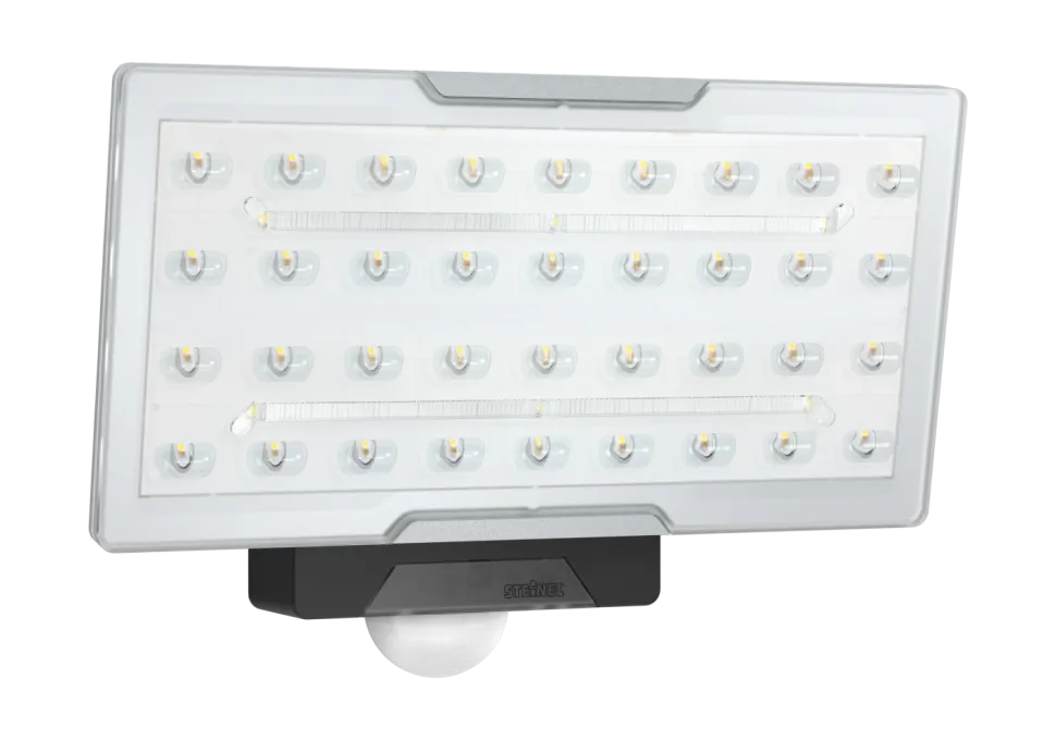 Новый широкий прожектор. Точность широкоформатного освещения. Благодаря матрице линз, разработанной STEINEL, и полностью поворачивающейся плоской световой головке можно добиться идеального освещения вдоль зданий или особенно больших площадей. Мощные светодиоды высшего класса создают впечатляющую яркость 2400 лм при потреблении всего 24,8 Вт. Встроенные светодиоды базового освещения обеспечивают ориентацию и безопасность при минимальном потреблении энергии. Датчик имеет угол обнаружения 240° и дальность действия 12 м. Версия ведомого устройства (SLAVE), которая предлагается отдельно, может быть легко подключена к прожектору с помощью кабеля.