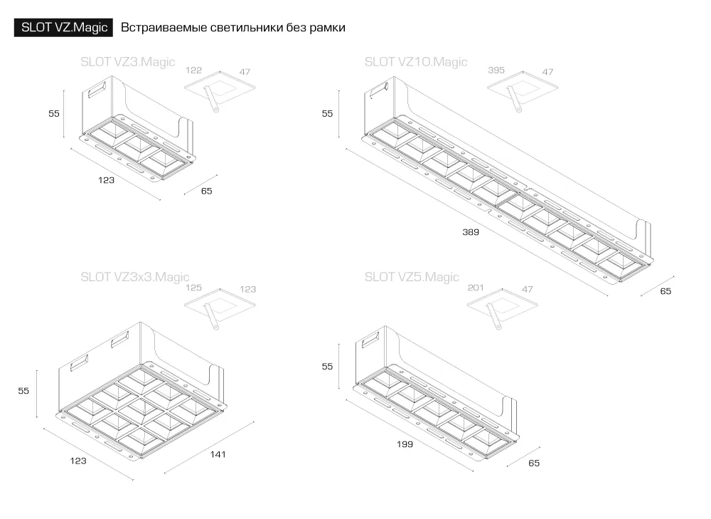Встраиваемые светодиодные светильники Slot VZ x5 без декоративной рамкой для монтажа заподлицо. Модификации с индексом "Magic" имеют прямоугольное пятно света (асимметричное светораспределение 35°x70°).